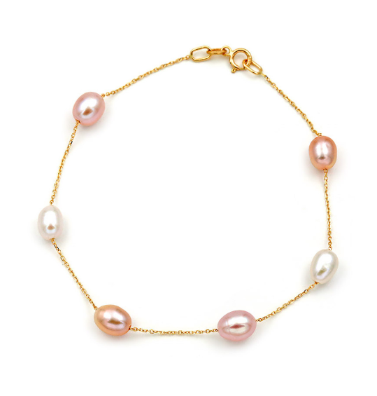 Bracelet featuring multicolored freshwater pearls (Freshwater Pearls) measuring 5.0 × 7.0 mm, oval shape, and graded AAAA quality. It is finished with a 14K gold chain and a secure 14K gold safety clasp.